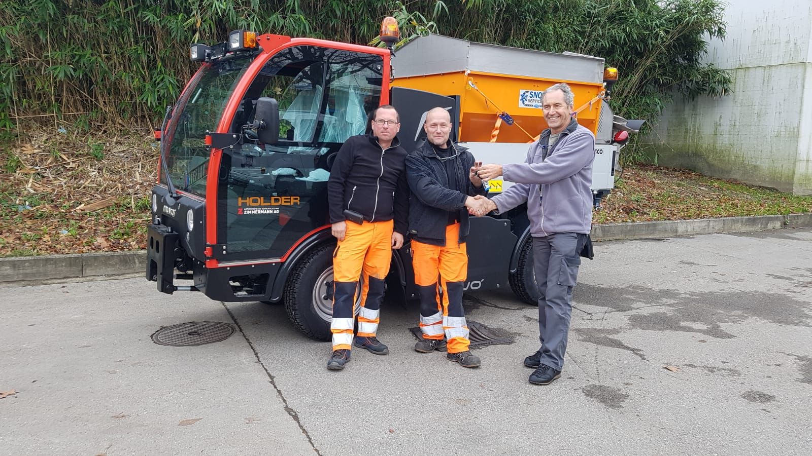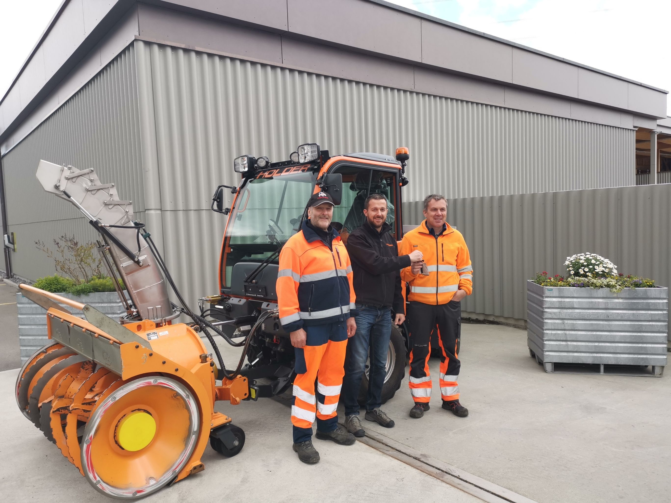 Übergabe eines Holder X45i Benziner. Zubehör für den Winterdienst ist ein Zaugg G3-140, und einen Salzstreuer von Simed.
