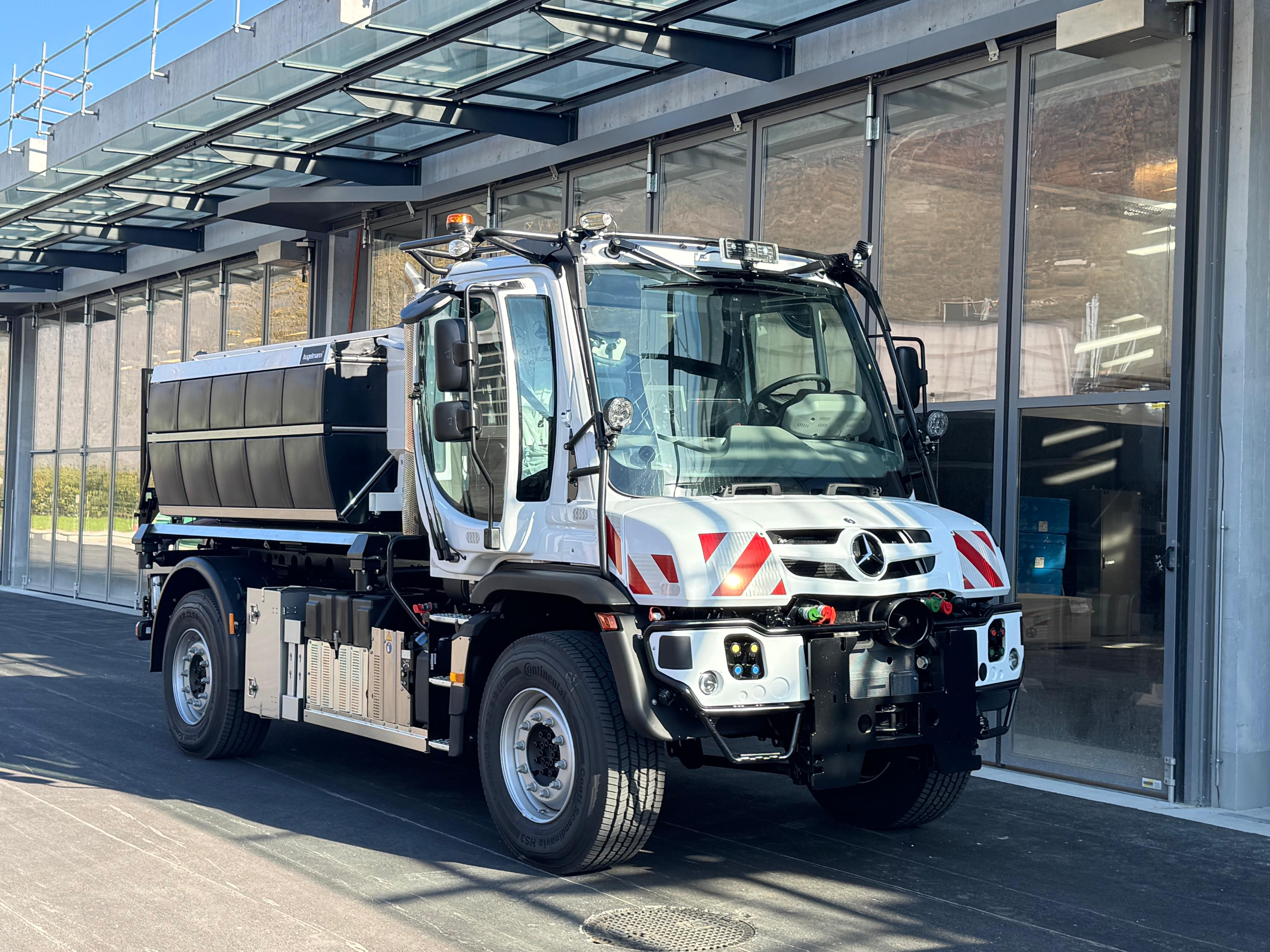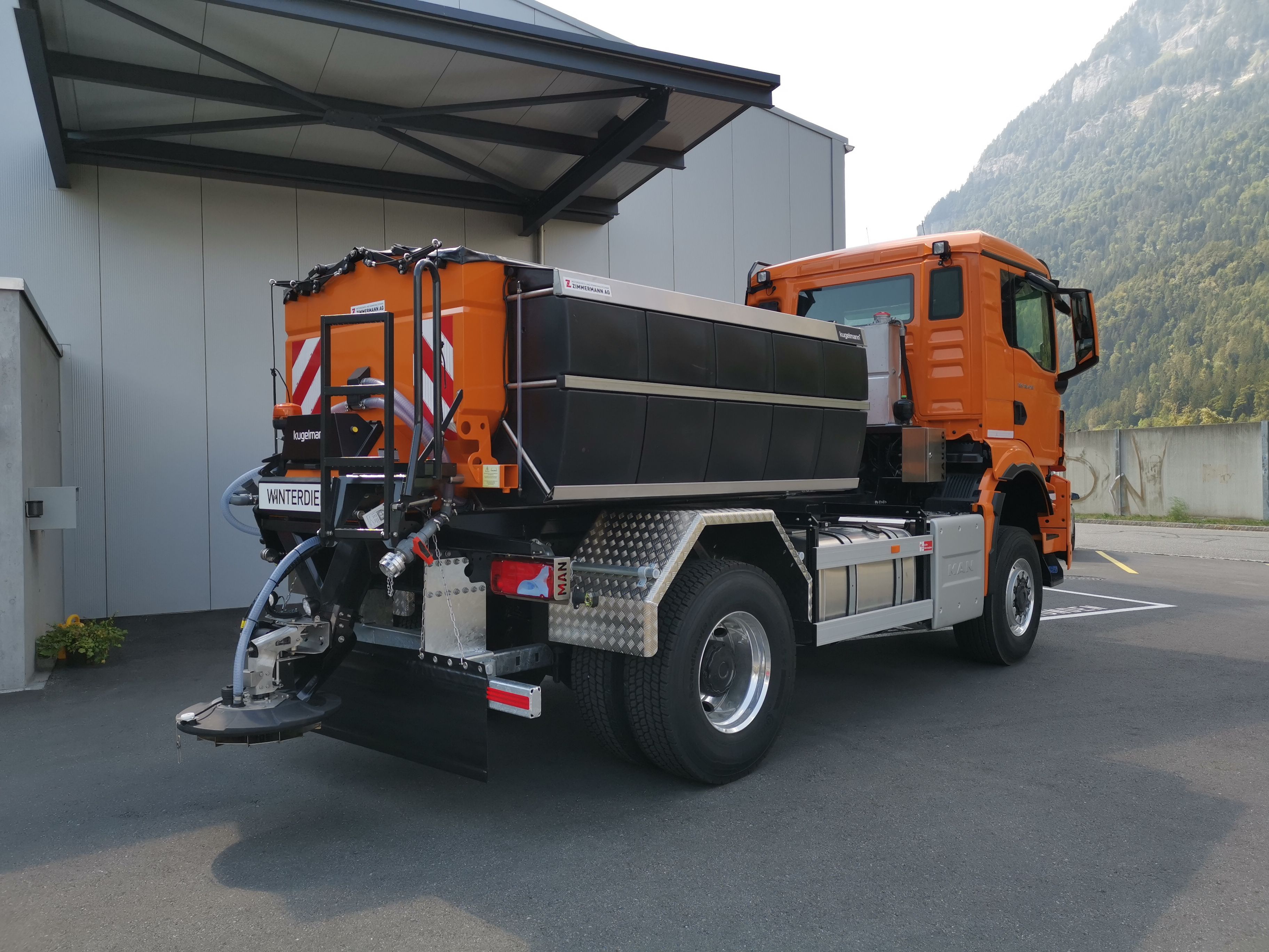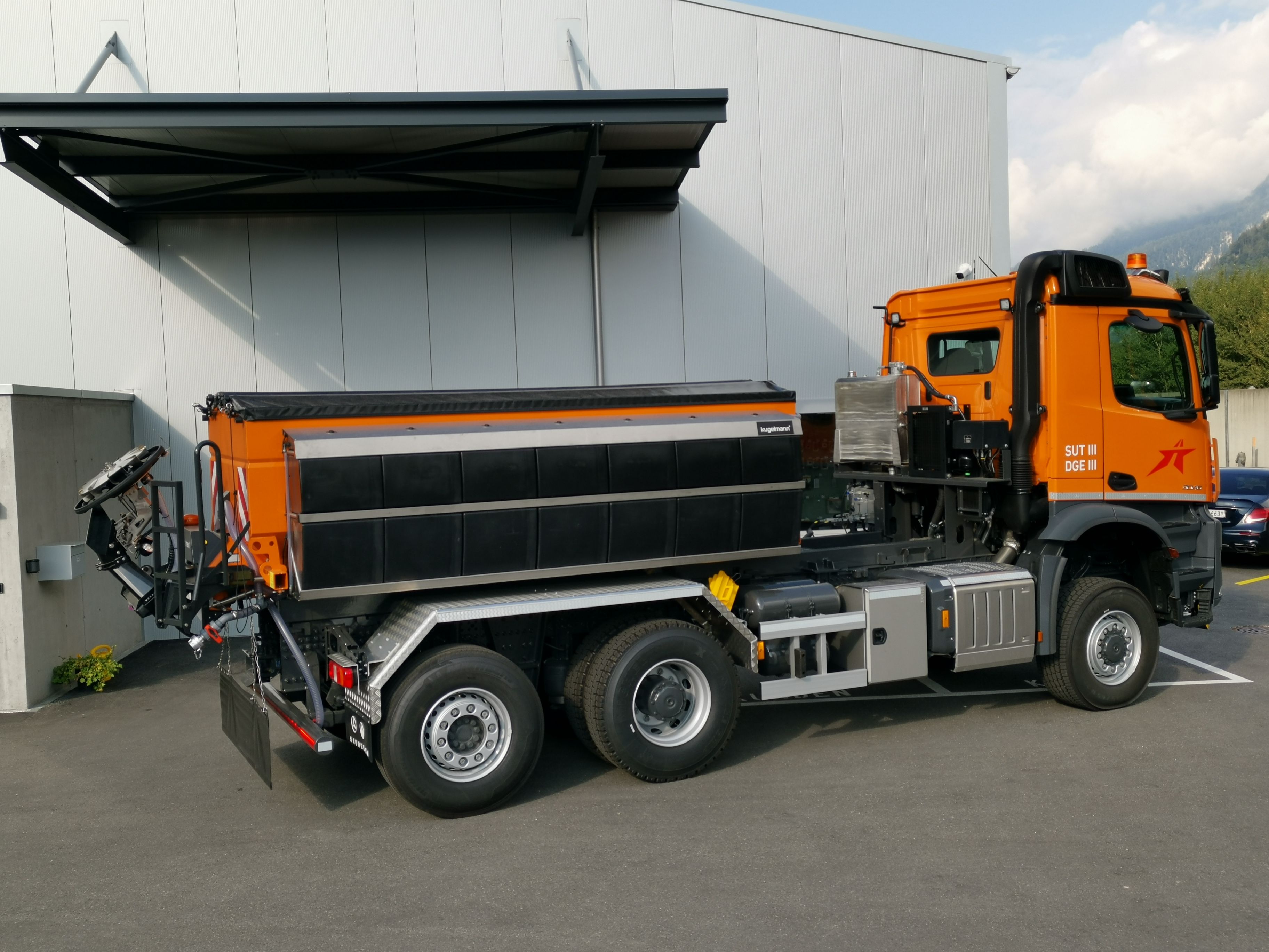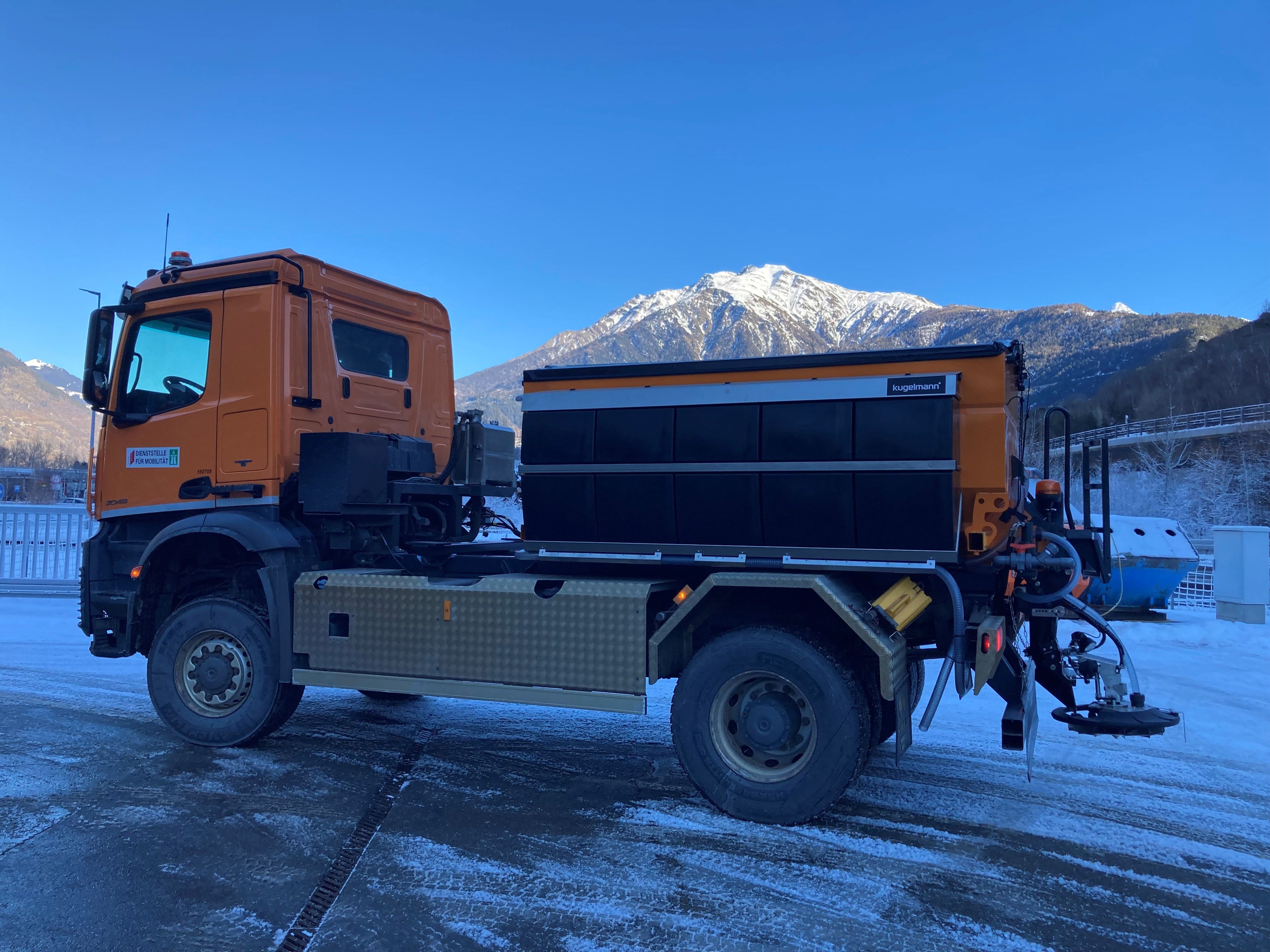 Für die Gebietseinheit III im Kanton Wallis, durften wir einen Mercedes-Benz Actros mit einem 4 m³ Kugelmann Duplex Streuer inklusive Soleanlage für 1700 Liter ausrüsten. Der Chromstahlstreuer hat mit seiner niedrigen Bauform einen optimalen Schwerpunkt. Die Soletanks sind aus Kunststoff und in diversen Grössen erhältlich. Die Streubreite kann vom Bedienerpult aus bis 12 Meter stufenlos geregelt werden.
