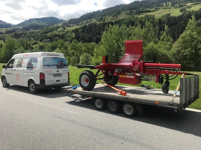Growi GSW 14 Waagrechtspalter mit 14 Tonnen Spaltkraft und hydraulischem Stammheber auf dem Weg zum Kunden in Donath GR.