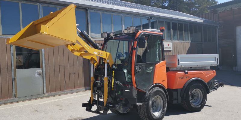 Der Holder ist mit einem Kugelmann Vario Schneepflug und einem Kugelmann Sole Streuer ausgestattet welcher im Sommer mit Giessanlage betrieben werden kann. Eine Brücke sowie einen Container-Träger runden die Lieferung ab und sorgen dafür das der Holder das ganze Jahr eingesetzt werden kann.